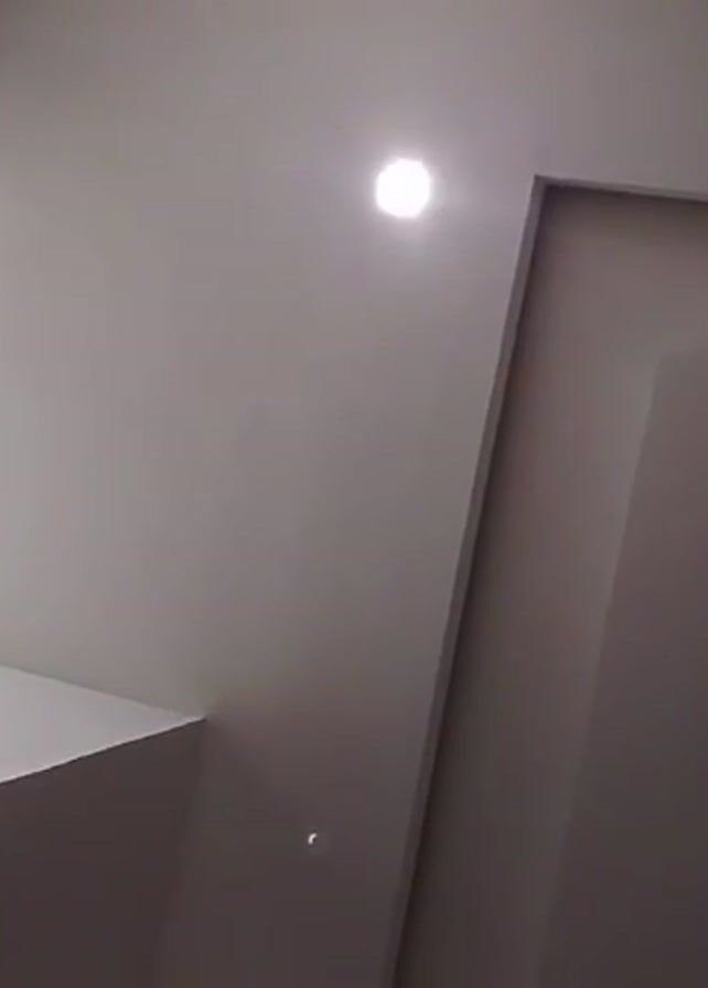 A low-angle shot shows a white room with a platform or shelf on the left. There is a dark cabinet or piece of furniture above the platform. Two ceiling lights illuminate the room, creating circular bright spots on the white walls. The right side of the frame features a recessed wall panel, also painted white. The overall aesthetic is modern and minimalist.