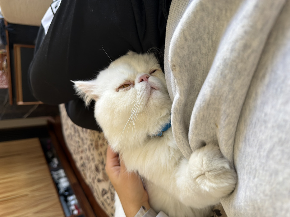 A white, short-nosed cat with amber eyes is snuggled against a person