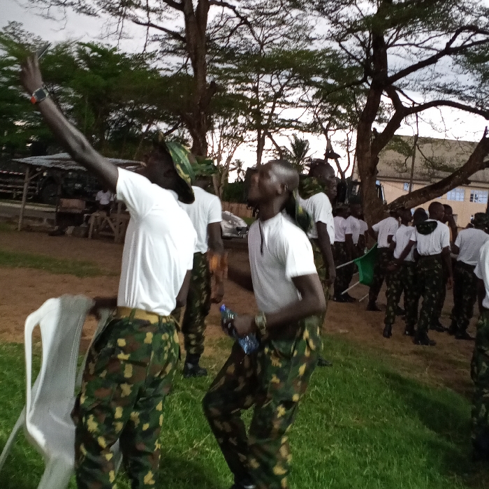 The image depicts an outdoor gathering of approximately fifteen to twenty young men, predominantly dressed in white short-sleeved t-shirts and camouflage trousers, in what is stated to be Koko, Nigeria. The scene unfolds under low light conditions, possibly dusk or dawn, on a grassy area transitioning to bare earth in the mid-ground. In the left foreground, a man with dark skin, wearing camouflage trousers and a white t-shirt, stands with his back partially to the camera. His right arm is extended upwards with two fingers forming a 'V' gesture, while a dark-colored wristband or watch is visible on his left wrist. He holds a white plastic monobloc chair in his left hand. To his right, another man, similarly attired, faces partially towards the camera, looking upward and slightly to his left, holding a clear plastic bottle in his right hand. Other individuals in similar uniforms, some wearing camouflage caps, are visible in groups throughout the mid-ground and background. One individual in the mid-ground holds a green flag. In the background, a light-colored, two-story building with multiple windows is visible on the right. On the far left, a rustic, open-sided structure with a corrugated metal roof is present. Numerous large trees with dense foliage are scattered across the background, contributing to the outdoor setting.