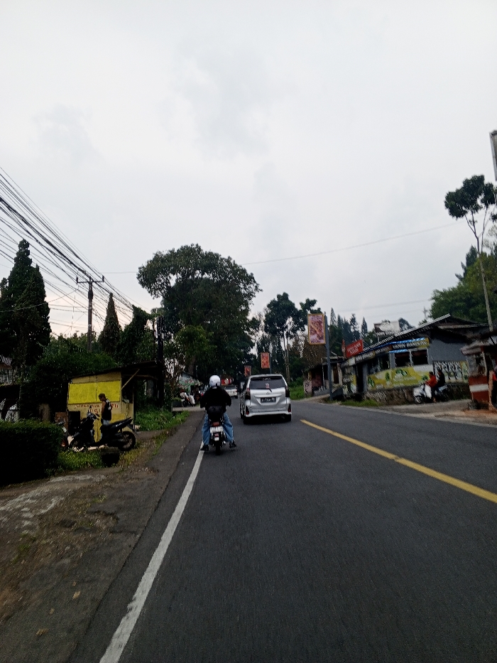The image depicts a street scene in Kheda, India, under an overcast sky. A dark asphalt road dominates the lower half, featuring a solid white line marking the left shoulder and a continuous yellow center line. In the immediate foreground, a person wearing a white helmet, dark jacket, and blue jeans is riding a black motorcycle, viewed from the rear, traveling forward in the left lane. Ahead of the motorcycle, a silver minivan, also viewed from the rear, occupies the right lane. To the left of the road, a dirt shoulder leads to a small, yellow, open-fronted kiosk or shop. A person in dark attire stands near this structure. Two dark-colored motorcycles are parked on the dirt shoulder adjacent to the kiosk. Behind the structures and vehicles, dense green foliage, including tall evergreen trees and a large broadleaf tree, is visible. Overhead, multiple utility lines are strung between poles. To the right of the road, a row of small buildings with corrugated metal roofs and various signs lines the street, suggesting commercial establishments. Several decorative red banners with patterns are hung vertically along this side. A scooter or motorcycle is parked near one of these buildings, and indistinct figures are visible in the vicinity. The overall environment suggests a semi-urban or rural roadside area.