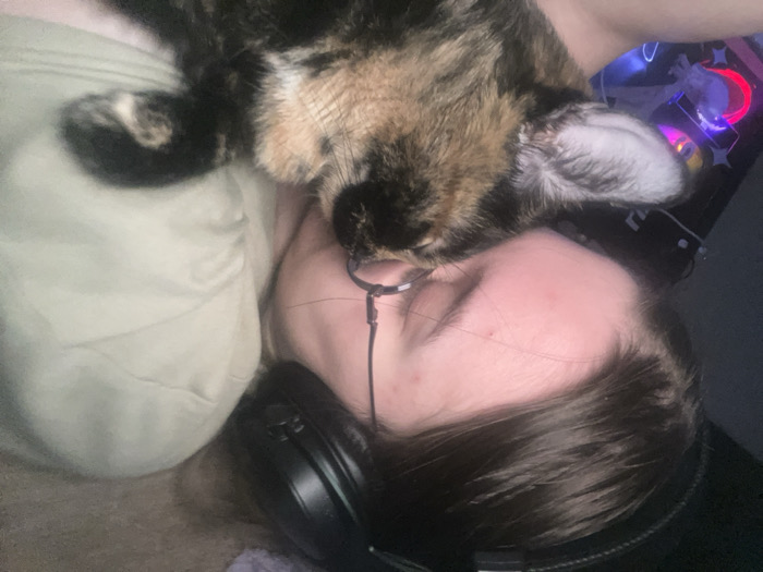 An individual with dark brown hair, wearing black over-ear headphones and eyeglasses, is depicted lying down, eyes closed or nearly closed, in an indoor setting located in Pushchino, Russia. The person's face exhibits some minor skin redness on the forehead and temple. They are clothed in a light-colored, possibly pale green, long-sleeved garment. A calico cat, displaying patterns of black, orange, and white fur, is positioned with its head resting against the person's face, near the cheek and chin area. One of the cat's paws is visible, resting on the person's garment. The background is dimly lit, with faint multicolored lights (red, purple, blue) visible to the left, suggesting the presence of electronic devices or ambient lighting. The scene portrays a tranquil interaction between the person and the cat.