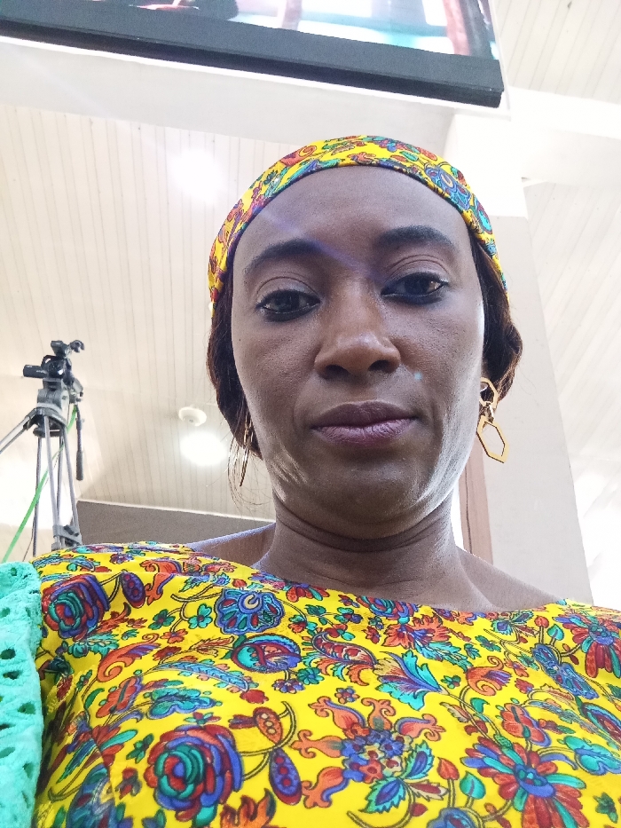 An adult female subject, primarily head and upper torso, is depicted in a close-up, upward-angled indoor portrait. She possesses dark skin, dark eyes lined with kohl, and reddish-brown lipstick. Her hair is styled under a yellow headband featuring a multi-colored floral and paisley pattern in red, blue, green, and orange. She wears a boat-neck garment, predominantly bright yellow, with a similar intricate floral and paisley design across the visible chest area. The upper part of her left sleeve, partially visible, appears to be a light green or teal open-knit or crochet fabric. A gold-toned, two-tiered hexagonal drop earring is visible on her right ear. The subject gazes directly forward, slightly upward, towards the camera. The background indicates an indoor environment with a light-colored, possibly paneled ceiling. Two recessed circular light fixtures are visible in the ceiling, one illuminated. To the subject's left, a professional video camera or camcorder on a tripod, featuring green elements, is visible. Above the subject's head, a large, dark rectangular screen or monitor displaying blurred colors is present. The specific location within Dadi Riba, Nigeria, is not identifiable from the provided visual information.