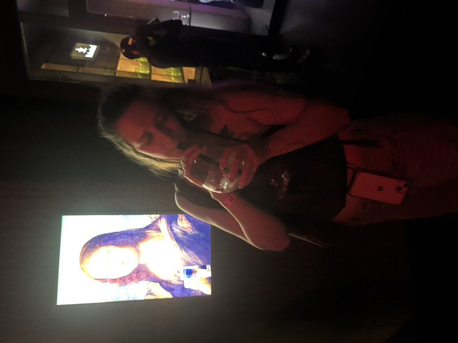 The scene depicts an indoor, dimly lit bar or nightclub environment, specifically identified as Sala King (also known as King's Room) in València, Spain, based on the distinctive crown logo and artistic elements. A Caucasian female, with long brown hair, is positioned slightly right of center in the foreground. She wears a dark sleeveless top and light-colored trousers, with a pink event wristband on her right wrist and a visible tattoo on her left arm. An iPhone in a clear case is attached to her waist via a lanyard. She is actively drinking from a large, stemmed glass containing a clear liquid and ice, using a dark straw. Her head is tilted downwards and to her right, and her face is illuminated by a warm, reddish light. To her left, a large, vertical, backlit display panel features a digitally altered rendition of Leonardo da Vinci's Mona Lisa portrait. The artwork is presented with distorted, vibrant colors (primarily purple, orange, and blue), and a blue Red Bull can or logo is visible in the lower-left portion of the portrait. To her right, a male figure is partially visible in silhouette, standing near a bar counter. He wears a dark shirt and a cap. Behind him, shelves stocked with bottles are illuminated with a distinct green backlight. Above these shelves, a square sign or mirror features a white crown symbol, indicative of the "KING" branding. The overall lighting is atmospheric, combining warm reddish tones on the foreground subject with cooler green and multi-colored illumination in the background.
