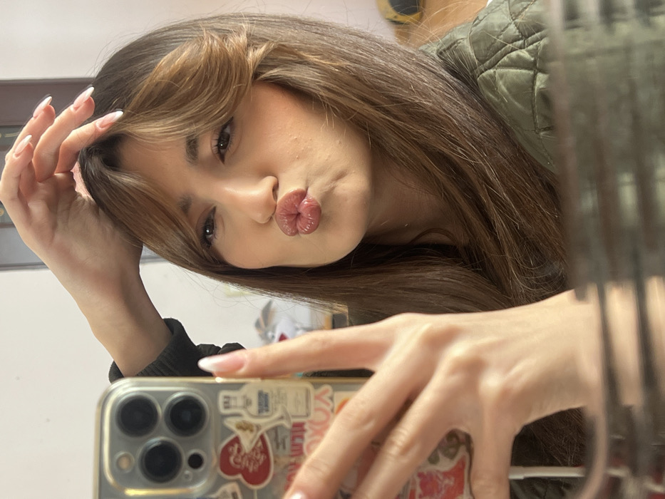 A young woman takes a selfie, tilting her head slightly. She has long brown hair with bangs, and a quilted green jacket is visible. Her lips are puckered in a kissy face. She holds her phone up, revealing a decorative case with stickers. A hand frames her face, nails manicured with white tips. The background includes a glimpse of a mirror with an indiscernible reflection.