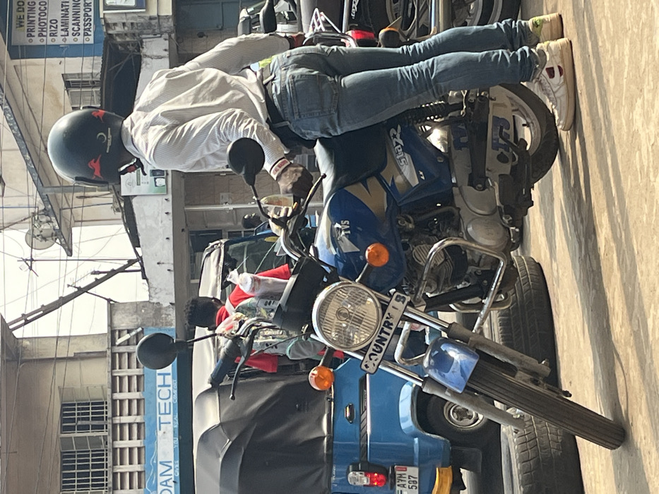 The image depicts a street scene in Freetown, Sierra Leone, specifically an urban commercial area. In the foreground, a male individual, seen from behind and the right side, stands astride a blue and silver TVS StaR 2 motorcycle. He wears a black motorcycle helmet with red crescent decals, a white long-sleeved striped collared shirt, blue jeans, and light-colored sneakers. A red and white wristband is visible on his right wrist. The motorcycle has its headlight illuminated and orange turn signals; its front license plate reads "COUNTRY 1B". The front wheel of the motorcycle rests on two stacked black tires on the paved ground. In the midground, to the left of the motorcycle, a light blue three-wheeled auto-rickshaw (tuk-tuk) with a black canopy is visible, bearing the Sierra Leonean license plate "AYM 597". Behind the tuk-tuk, a person in a red shirt with a backpack is seen from behind, carrying a clear plastic bag containing white items. Other individuals are partially visible in the background. The background features multi-story buildings. On the left, a building displays a blue sign with "ADAM TECH" and "GIVES YOU REAL COMFORT" text. On the right, another building exhibits a white and blue sign listing services: "PRINTING PHOTOCOPY RIZO LAMINATING SCANNING PASSPORT". Overhead, utility wires and poles are visible against a bright, hazy sky. Shadows on the ground suggest a sunny environment.