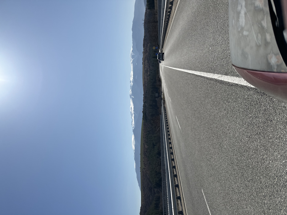 The image depicts an asphalt highway scene in the vicinity of Dyakovo, Bulgaria, viewed from a moving vehicle. The foreground features the partial, maroon-colored hood and windshield of the observer's vehicle, showing some surface wear. The multi-lane highway, marked with white solid and broken lines, stretches into the distance, appearing to ascend a gentle incline or curve. Metal guardrails line both sides of the roadway. Further down the highway, a dark-colored sedan and a lighter-colored vehicle are visible, proceeding in the same direction away from the observer. On the right side of the road, a blue rectangular directional sign and a smaller circular blue and white road sign are present. The mid-ground consists of rolling hills covered with dense tree lines. Beyond these hills, a prominent range of distant mountains with extensive snow-capped peaks is visible against a clear, bright blue sky. The sun is positioned in the upper right quadrant of the sky. No individuals are discernible in the scene.