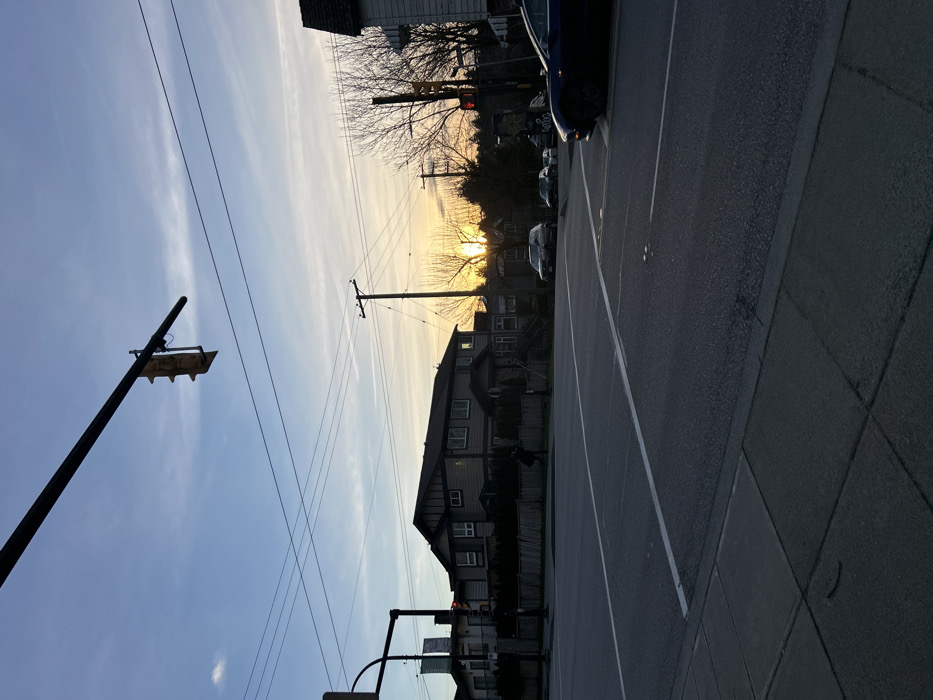 A street scene features parked cars and a residential building illuminated by a setting sun. Overhead power lines crisscross the sky, leading to a traffic light on the left. The road, divided by a white line, stretches toward the sun, transitioning into a sidewalk on the right. The overall perspective gives a sense of depth, with the sunlight creating a warm glow against the urban environment.