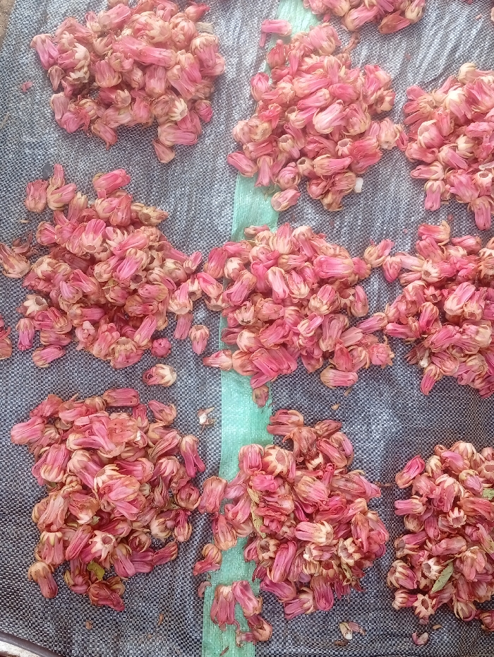 - "This image, taken in Wamba, Nigeria, depicts an overhead view of numerous dried, pinkish-red, trumpet-shaped flowers or flower buds" by FM-xL0Ov1, licensed under CC BY 4.0