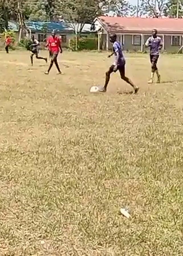 A wide shot shows a group of young men playing soccer on a grassy field. The field is mostly dry, with some patches of green. Several buildings and trees are visible in the background. The players are wearing a variety of jerseys, including red, blue, and purple. They are actively moving around the field, kicking the ball and interacting with one another.