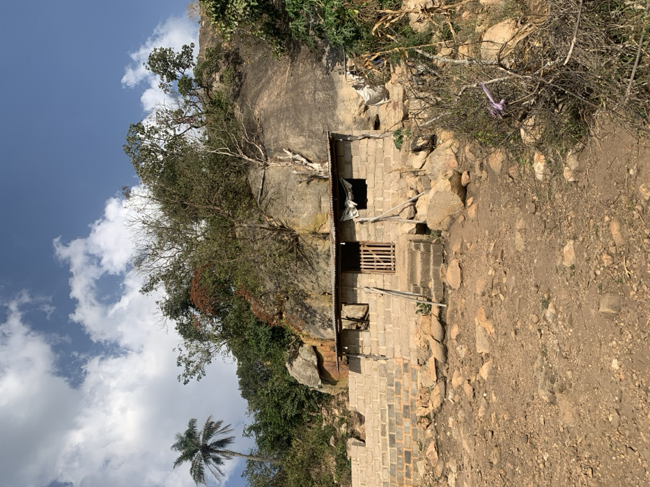 The image depicts a rural scene in Egbedi, Nigeria, under a partly cloudy blue sky. In the foreground, the ground is composed of reddish-brown dirt and gravel, heavily strewn with various-sized natural rocks and boulders. Sparse, dry vegetation and thorny brush are visible on the right. A single-story structure, approximately 4 meters wide and 3 meters high, is centrally located. It is constructed from light-colored concrete blocks and features a corrugated metal roof, which appears weathered. The front of the building has a central wooden slatted door, accessed by three concrete steps. To the left of the door is a rectangular, open window aperture. To the right of the door, another similar window aperture is partially covered by a piece of white fabric or plastic material. Two slender, un-milled wooden poles lean against the front of the structure, one on each side of the steps. The building is situated directly against a large, uneven rock face that forms the base of a rocky hill. The hill is densely covered with a mix of deciduous and evergreen trees and shrubs, exhibiting varied green, brown, and reddish foliage. A tall, slender palm tree with a distinct crown of fronds stands on the far left, against the sky. Numerous large, weathered boulders are visible embedded in the landscape, both around the building's foundation and further up the rocky slope. No individuals or specific actions are depicted in the scene.