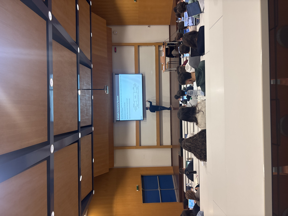 The image depicts an indoor lecture hall or large classroom in Porto Salvo, Portugal. A male lecturer, dressed in a dark blue shirt and dark pants, stands at the front of the room on a raised wooden stage. He is facing a large white whiteboard, holding a marker in his right hand, and appears to be writing or pointing towards it. Above the whiteboard, a projector screen displays a slide titled "A simple Inventory System," featuring text and a flowchart diagram. A projector is mounted from the ceiling, casting the image onto the screen. In front of the stage, approximately two dozen students are seated in tiered rows of white desks and dark chairs. The students are primarily visible from their backs and heads. Several students are using open laptops, some are observing the front, and others have notebooks or water bottles on their desks. The room features light wood-paneled walls with darker trim and horizontal white sections. A set of double blue doors is visible on the far left wall. The ceiling consists of a grid of rectangular wooden panels with integrated circular lights and dark structural beams. The overall environment suggests an academic or professional presentation setting.