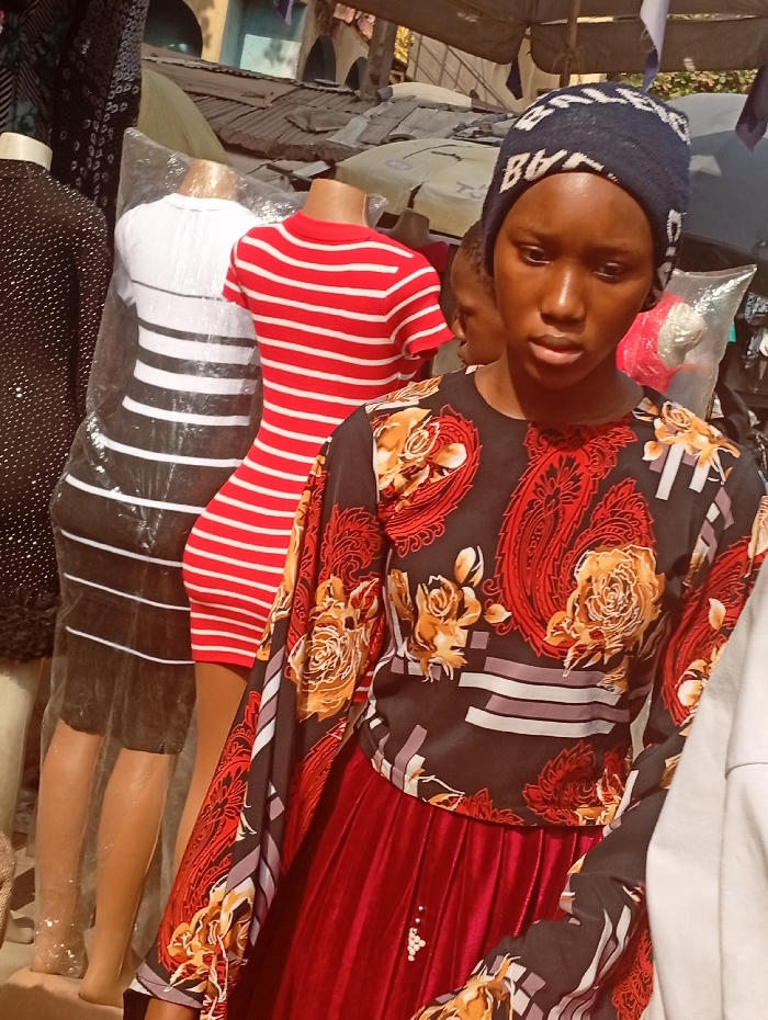 The image captures an outdoor market scene in Fegge, Nigeria, primarily focusing on a young individual