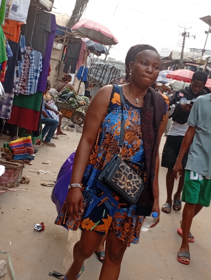 A woman walks through a busy outdoor market. She wears a patterned dress, sandals, and a crossbody bag. A shawl is draped over her shoulder and she carries a purple plastic bag. Other people are seen nearby, some wearing casual clothing. Market stalls and various merchandise, including clothing, are visible in the background. The scene is crowded and the ground appears to be littered.