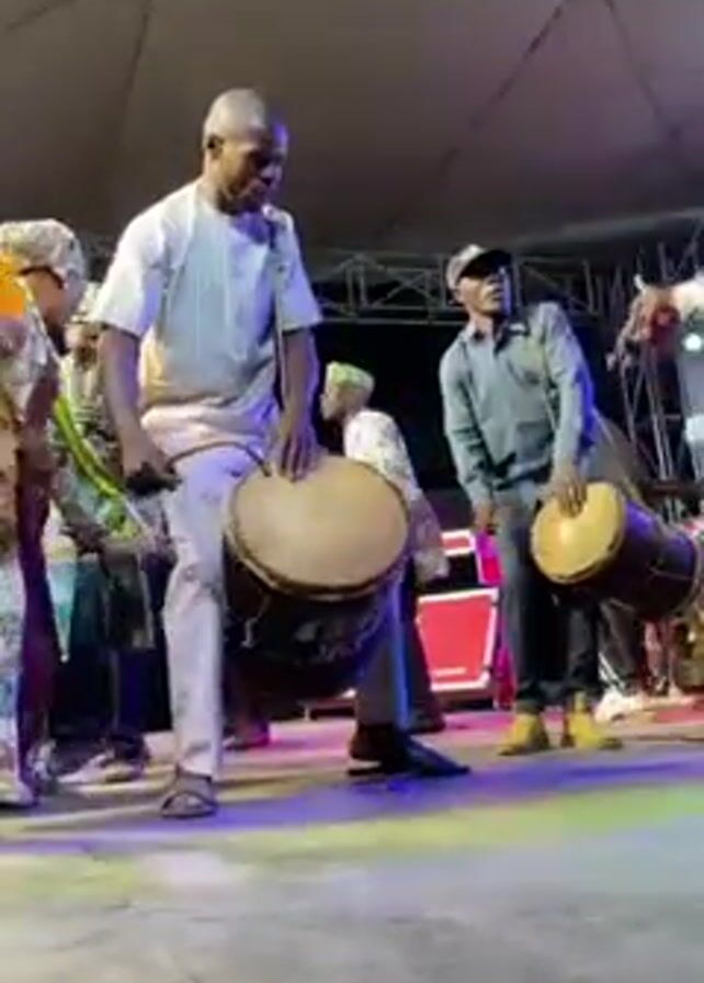 performance on a stage. Two men are playing traditional drums while other people dance around them. One drummer is wearing a white long-sleeved shirt and pants and sandals, while the other is wearing a denim-like shirt, black pants, and a baseball cap. Several other people are on the stage, including a woman in a yellow shirt and jeans, and a woman in a long floral dress. The stage is under a large tent or roof. There are lights visible behind the performers. A red and white sign can be seen in the background as well.