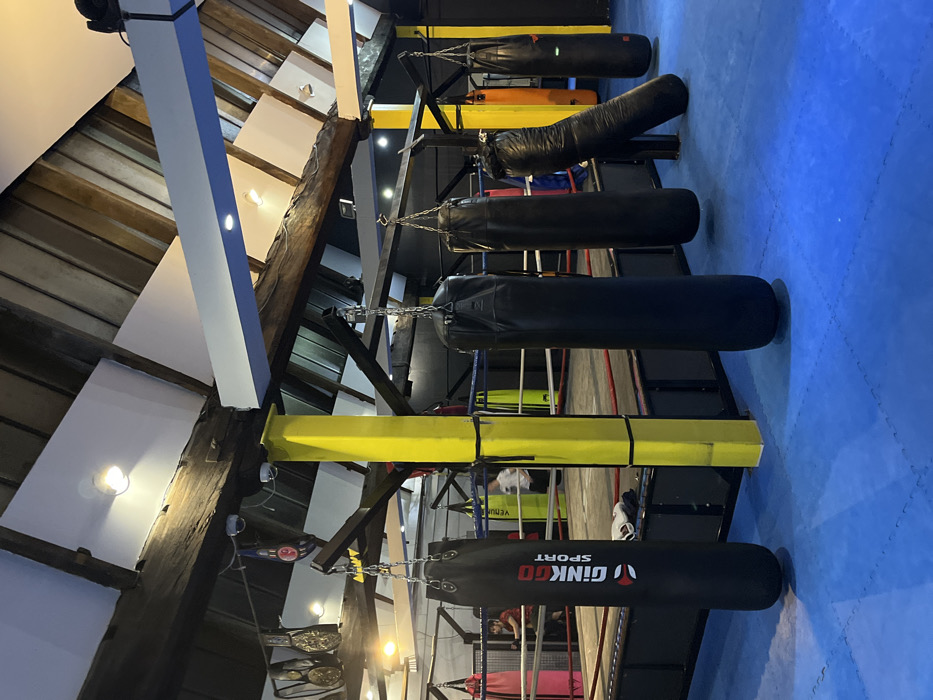 The image depicts an interior view of a boxing and martial arts gym located in Tourcoing, France