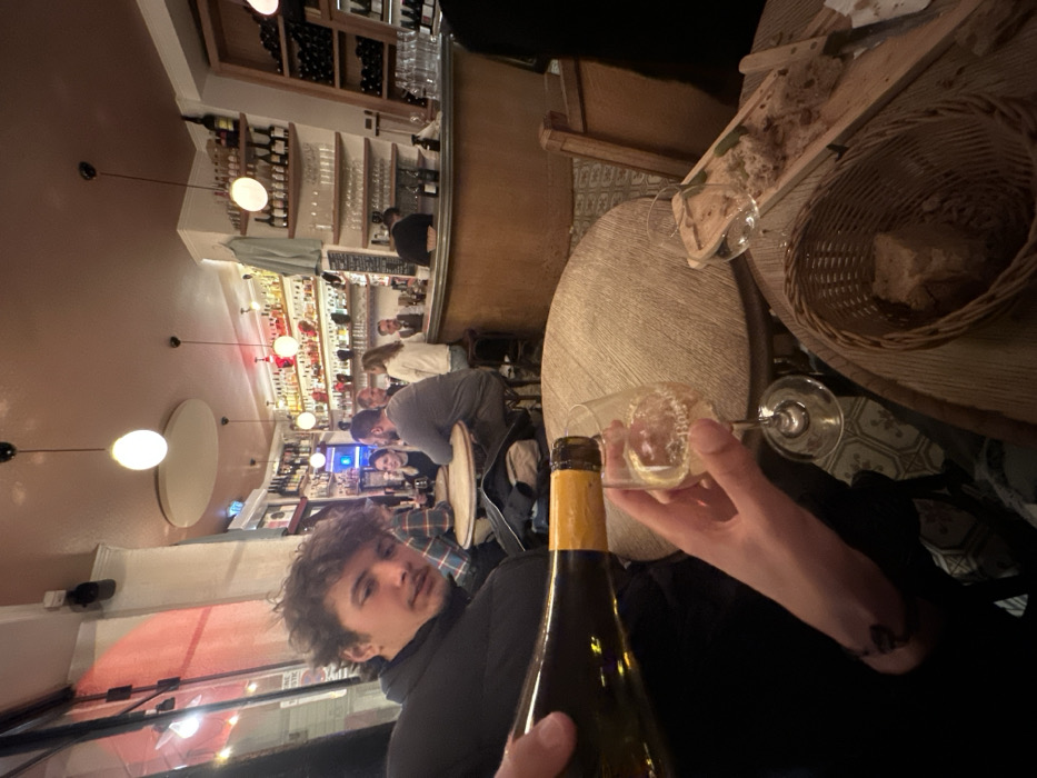 The image depicts the interior of a bustling bar or bistro in Paris, France, during evening hours. In the immediate foreground, a hand holds a clear stemmed wine glass, receiving a pour of white wine from a green glass bottle with a yellow foil top, held by another hand. A young man with curly brown hair and a dark jacket is seated to the left, looking directly at the viewer. On the round wooden table in front, a wicker basket contains several pieces of bread, and a rectangular wooden serving board holds remnants of food and a knife. In the midground, several patrons are seated at small, round wooden tables. One table features a man and a woman engaged in conversation. Towards the right, a long, curved wooden bar counter spans the length of the room. Behind the bar, shelves are extensively stocked with bottles of wine and spirits, alongside various glassware. A staff member is visible behind the bar, attending to duties. Additional wine bottles are neatly arranged in wooden racks on the far right wall. The establishment is illuminated by warm, spherical pendant lights suspended from the ceiling and ambient lighting from the bar area. The walls are painted in shades of reddish-brown and cream, contributing to a cozy atmosphere. The floor features a patterned tile design. Visible windows on the far left indicate an exterior street view, reflecting some light into the interior.