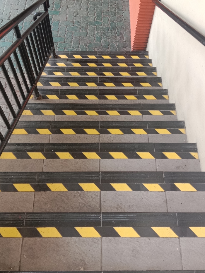 A high-angle shot showcases a staircase. Each step is tiled in alternating shades of gray, and accented with a strip of black and yellow hazard tape. A black metal railing runs along the left side, while a white wall is on the right. The top of the staircase is tiled with green and gray geometric patterns. The scene is well-lit, highlighting the textures and patterns of the stairs.