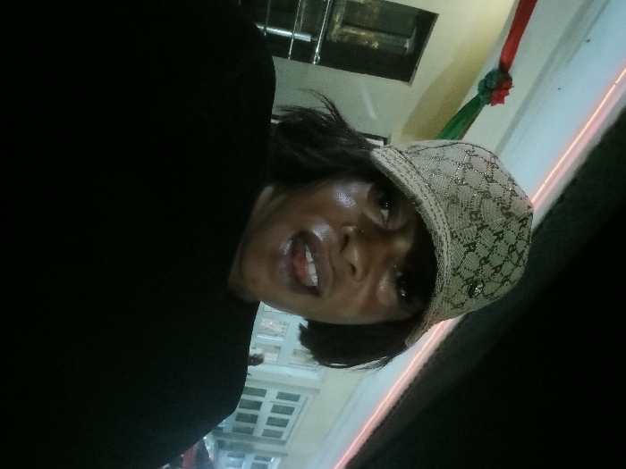 A woman with short dark hair, wearing a patterned cap, looks at the camera with her mouth slightly open. She is wearing a black top. In the background, there's a window with bars, a wall with festive decorations, and a strip of light. The perspective is from below, angled upwards at the subject.