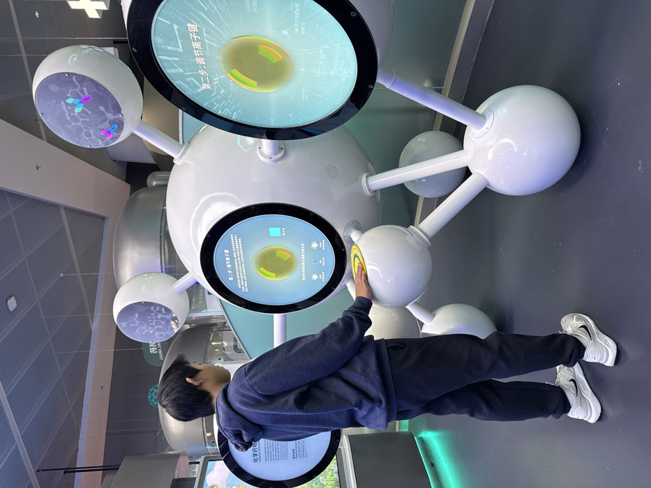 An indoor scene in an exhibition space within Guangming District, China, depicts a young male interacting with a large, white, multi-spherical interactive display