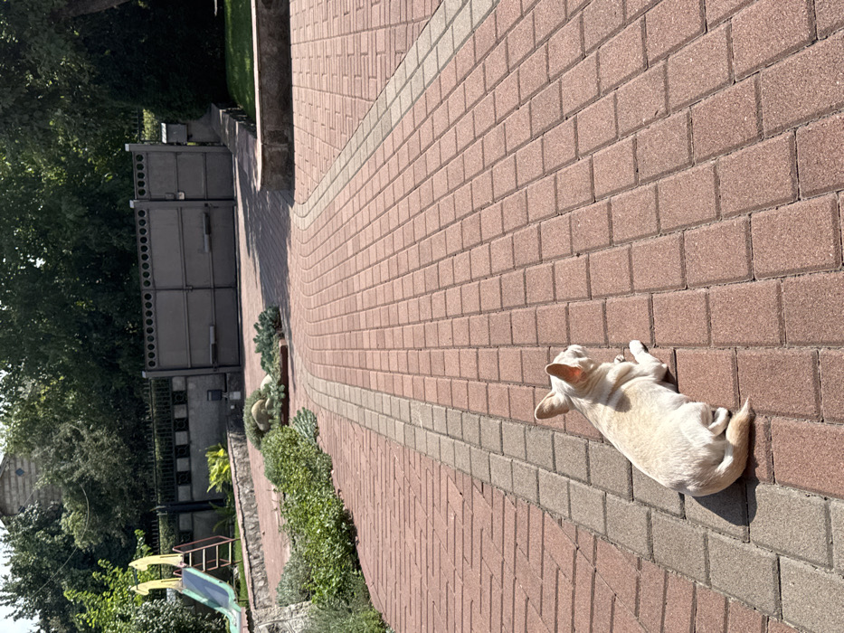 The image displays an outdoor residential setting in Petropavlivska Borshchahivka, Ukraine, illuminated by strong daylight. A light-colored chihuahua dog is positioned in the lower-left foreground, lying on a paved surface. The dog faces away from the camera, its head turned slightly to the right, observing the background. The paving consists of reddish-brown rectangular interlocking bricks, interspersed with a longitudinal stripe of lighter grey-brown bricks running through the center of the visible path. To the left of the paved area, a raised garden bed features various green shrubs and multiple light-colored stones. Beyond this, a children's slide, green with yellow giraffe-head-shaped supports, is visible. A dark metal fence spans the mid-ground. In the central and right background, a large, closed, dark grey metal driveway gate with a perforated upper section is prominent, flanked by a smaller pedestrian gate to its right. Dense green trees and foliage form the furthest background. A segment of a stone retaining wall borders the paved area on the right, adjacent to a patch of green grass. Direct sunlight casts distinct shadows, including one from the dog. No human subjects are present.