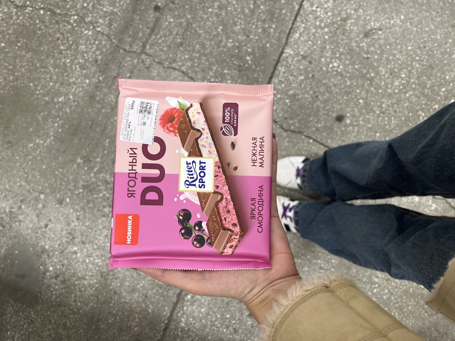 An overhead, slightly angled photograph captures a person's lower body and left arm holding a Ritter Sport "ЯГОДНЫЙ DUO" chocolate bar in Krasnoyarsk, Russia