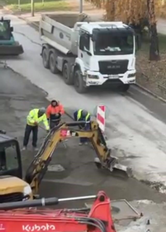 road construction site. Three workers wearing bright safety vests are working on a section of asphalt. One worker is using a shovel, another is standing and looking at the work, and the third is bending over and working with a tool. A yellow CAT excavator is positioned over the area being worked on. In the foreground, part of a red Kubota excavator is visible. Behind the workers, a white MAN dump truck is parked on the street. Further behind, a green road roller is visible. The scene appears to be outdoors during the day, with a bare tree in the background and street signs visible.