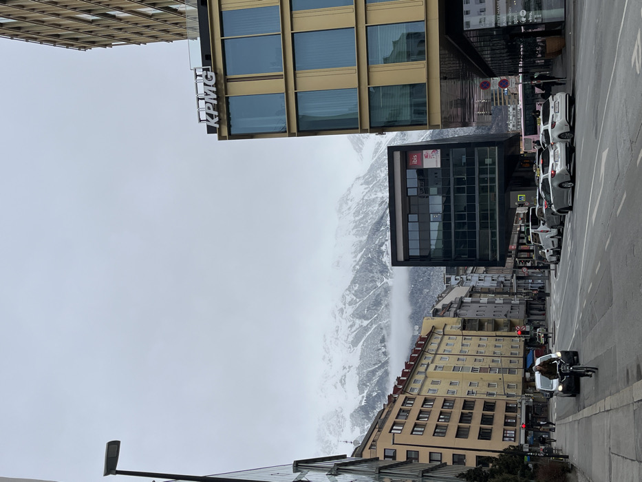 An urban landscape shows buildings on either side of a street, with a backdrop of snow-covered mountains. A building with the KPMG logo stands prominently on the left. A dark building features the word "ibis." Cars are parked along the street, and a cyclist rides by. The sky is overcast and grey. Buildings are beige and tan. The photo is rotated, requiring a tilted perspective.