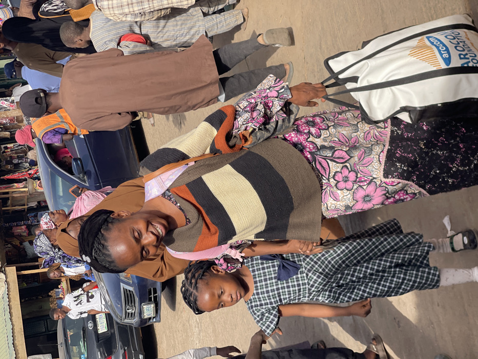 The image depicts a crowded outdoor scene in Samaru, Nigeria, likely a market or street. In the foreground, a woman with braided dark hair, wearing a multi-colored striped long-sleeved top, a floral skirt, and a light-colored backpack, smiles broadly while walking forward. She holds the left hand of a young girl, approximately 5-7 years old, also with braided dark hair, who walks beside her in a plaid dress with a dark blue bow, white socks, and dark shoes. The woman carries a large white tote bag with black handles, displaying the "arocom AROCO FOUNDATION" logo, in her right hand. In the midground, a dark blue sedan with a visible Nigerian license plate is parked, with several individuals standing or walking around it. One person in an orange safety vest and a red hat is partially visible near the driver's side of the sedan. To the right, a man in a brown tunic and dark cap walks away from the camera. Other individuals, including women in traditional head coverings and children, are present in the background, indicating a busy public space. Storefronts or stalls with corrugated metal roofs are visible in the distant background. The ground is unpaved and appears dusty, illuminated by bright daylight.
