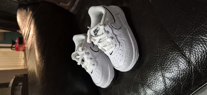 - "Two infant-sized, white Nike Air Force 1 sneakers sit on a black leather surface" by FM-Grq9g2, licensed under CC BY 4.0