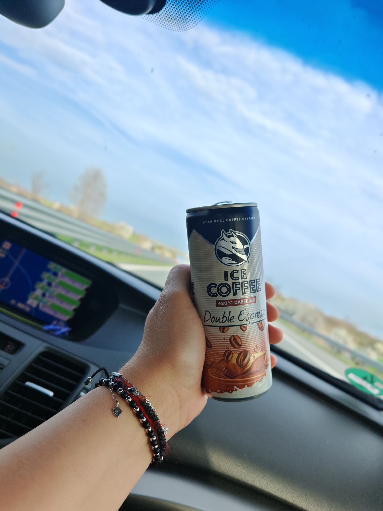 The image displays a close-up, first-person perspective from within a vehicle, located in Manolsko Konare, Bulgaria, looking out through the windshield during daylight hours. A human right hand, adorned with multiple bracelets (including one black and red woven bracelet with a silver heart charm, and another composed of dark beads), occupies the center-right of the frame, holding an upright silver beverage can. The can is labeled "ICE COFFEE Double Espresso" with "+20% CAFFEINE" and "WITH REAL COFFEE EXTRACT," featuring a stylized white animal head logo (resembling a wolf or fox). To the left, a portion of the vehicle's dark dashboard is visible, including a navigation screen displaying a map interface with colored routes. The background, viewed through the windshield, shows a multi-lane highway or road with safety barriers and green roadside foliage. The sky is clear blue with sparse white clouds, and distant trees with bare branches are visible on the horizon.