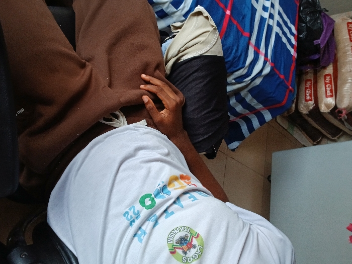 An individual is seated indoors, seen from the upper torso to the upper legs, on what appears to be a dark-colored office chair. The person wears a white t-shirt featuring a circular logo on the chest that clearly states "LAGOS TOURISM" and includes the number "22", indicating a connection to Lagos, Nigeria. They are wearing brown trousers, with a white drawstring visible at the waist. Their right hand rests on their right thigh. To the left, a surface covered with a blue and white striped blanket is visible, with a black bag and tan fabric resting on it. In the background, stacked light-colored sacks bearing the red "My Chef" logo are present, suggesting the storage of food items, likely rice. Adjacent to the sacks on the right, a large white appliance or cabinet stands. The floor is tiled with light-colored squares. The presence of "LAGOS TOURISM" branding and "My Chef" branded goods, common in the region, indicates the location is within Lagos, Nigeria, likely in a residential or small commercial setting.