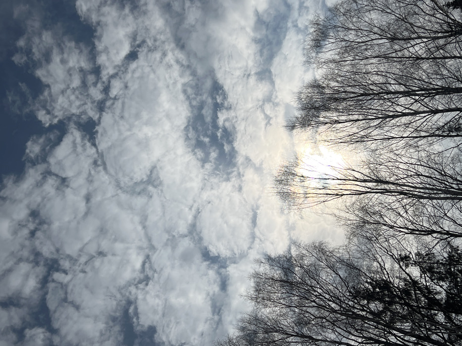 The image presents an outdoor natural scene featuring a sky and trees. The upper two-thirds of the frame are filled with a partially cloudy sky, displaying a mix of visible blue sky and white to light grey altocumulus or stratocumulus clouds. A bright, diffuse sun is evident through the clouds, positioned slightly to the right of the vertical center axis in the lower part of the sky. The lower third of the image shows the upper sections and bare branches of several deciduous trees, silhouetted against the bright sky, indicating a leafless season. A darker, evergreen conifer is visible on the far lower left. No people, animals, or man-made structures are present. The specific location within the city of Сергино, Russia, cannot be ascertained from the visual evidence provided.