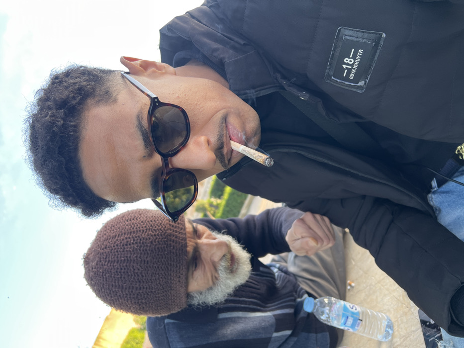 Two males are present outdoors in Al Machouar – Stinia, Morocco, under a clear, bright sky. In the immediate foreground, a younger male, with short dark curly hair, a mustache, and wearing dark, tortoise-shell sunglasses and a black puffer jacket with a " -18 GDYKJGUHYTR" patch on the left chest, holds a lit cigarette between his lips, exhaling smoke. He is positioned facing the camera, suggesting a selfie. Behind and to the left, an older male with a long white beard and mustache, wearing a brown knitted beanie and a blue and grey striped shirt, is partially visible, appearing to look downwards. A clear plastic water bottle with a blue cap is on the light-colored ground in front of the older man. The older man's right hand is raised slightly, palm open. Green foliage and a light-colored wall or structure are discernible in the background.