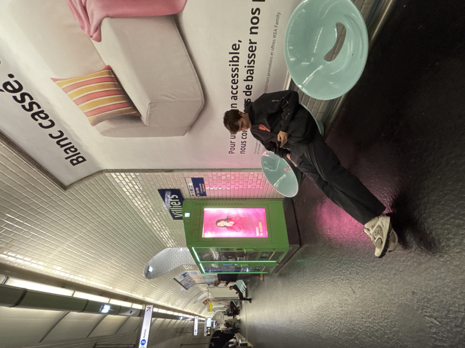 The image captures a brightly lit platform within the Villiers Metro Station in Paris, France, identifiable by a blue "Villiers" sign and a "2 Nation" line indicator. In the immediate foreground, a young male individual sits on a light blue, shell-shaped bench, leaning back against the white-tiled wall. He wears a dark hooded sweatshirt with a red lightning bolt emblem, dark pants, and light-colored sneakers, and is engrossed with a smartphone held in both hands. The station's walls are clad in white rectangular tiles, meeting a white, arched ceiling equipped with fluorescent strip lighting. A prominent advertisement on the right wall features a white sofa with a striped cushion and a pink throw, accompanied by French text including "Blanc cassé." and "Pour un accessible," consistent with an IKEA campaign. Further down the platform, a tall, green vending machine or display unit emits a strong pink light from its screen, illuminating a female figure. The dark, reflective floor shows the pink light's reflection. Several other passengers are visible standing and sitting further along the platform in the background.