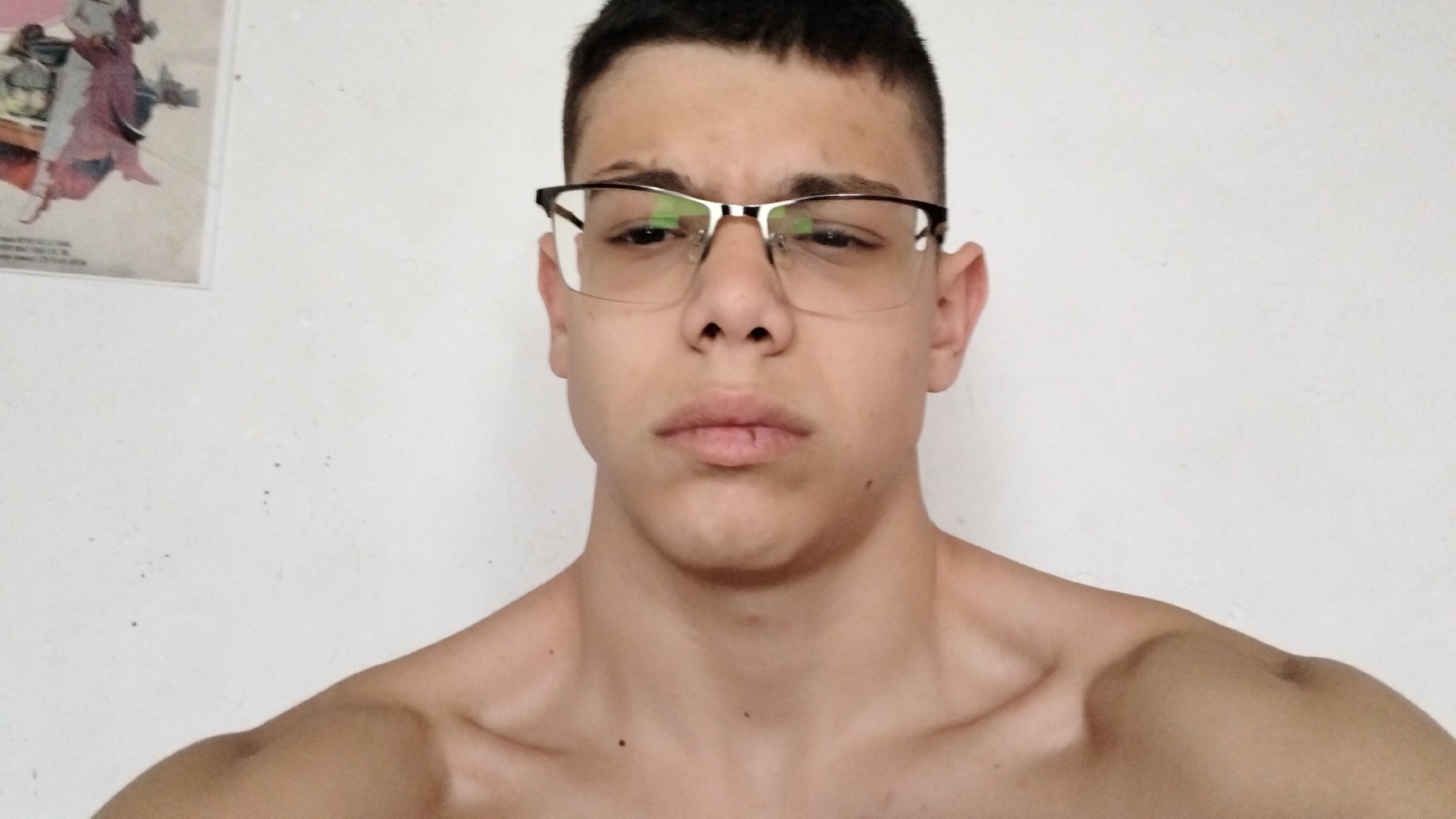 The image depicts a close-up, frontal view of a young male subject against a plain white, textured wall. The subject appears to be in his late teens or early twenties, with short, dark, closely cropped hair. He wears dark-rimmed, semi-rimless eyeglasses. His facial expression is neutral, with his mouth slightly parted. He is shirtless, revealing his shoulders, prominent collarbones, and upper chest, which exhibit muscular definition. The lighting is even, suggesting an indoor setting. In the upper left corner of the frame, a portion of a poster or picture is visible, depicting a figure, possibly a woman, in what appears to be a long garment, oriented upside down relative to the subject. The specific location within the city of Troyan, Bulgaria, cannot be determined from the visual information present in the image.