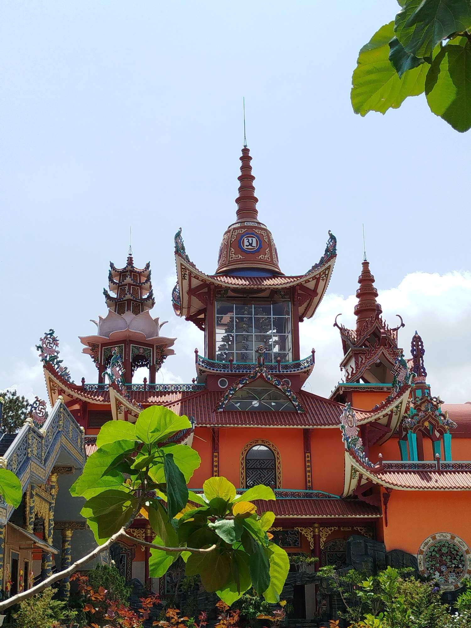 A low-angle shot showcases the distinctive architecture of the Linh Phuoc Pagoda in D'Ran, Vietnam, under a bright, partially cloudy sky. The pagoda's roof is predominantly orange and red, exhibiting intricate designs and upward-curving eaves, adorned with colorful patterns. A central, taller structure with a glass-encased section and a conical spire is flanked by smaller, similarly styled towers, one resembling a lotus flower. Leaves from a tree in the foreground partially obscure the lower portions of the pagoda, adding depth to the composition. The scene suggests a serene, cultural, and architectural focus, highlighting the unique aspects of this Vietnamese pagoda.