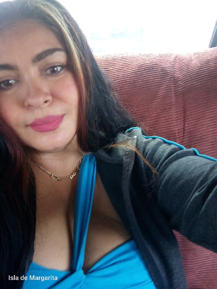 A woman with dark hair, including shades of blonde and red, wears bright pink lipstick and a delicate gold necklace. She's wearing a low-cut turquoise top under a gray hooded jacket with light blue trim. The background appears to be a reddish-brown textured surface, likely a seat. The text "Isla de Margarita" is visible in the lower left corner of the image.
