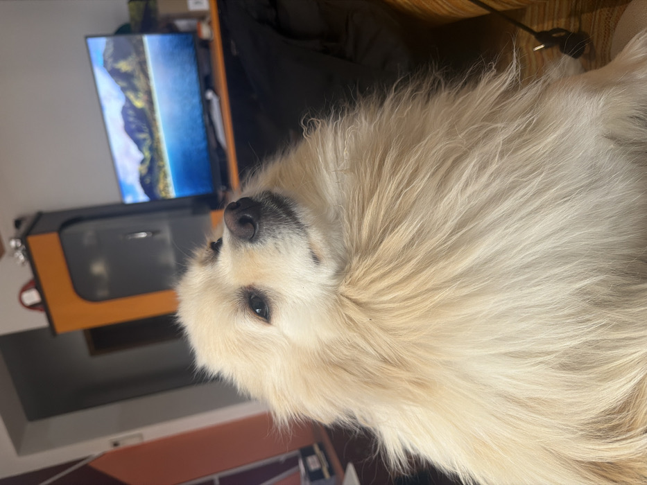 The image displays an indoor residential environment, likely a living room. A cream-colored, fluffy domestic dog, appearing to be a Pomeranian or similar Spitz breed, occupies the foreground, positioned slightly to the right and looking upwards with a tilted head. Its dark eyes and nose are prominent amidst its dense, light-toned fur. In the background, a flat-screen television displays a landscape image featuring mountains bordering a body of water under a bright sky. The television rests on a dark orange surface. To the left of the television, a cabinet with an orange frame and dark gray or black panels is visible, with a small red object on its top surface. A doorway is partially visible in the far background. A dark cable is present on a striped, upholstered surface in the lower right. No human subjects are visible. The specific location in Devin, Bulgaria, cannot be determined from the visual evidence provided.