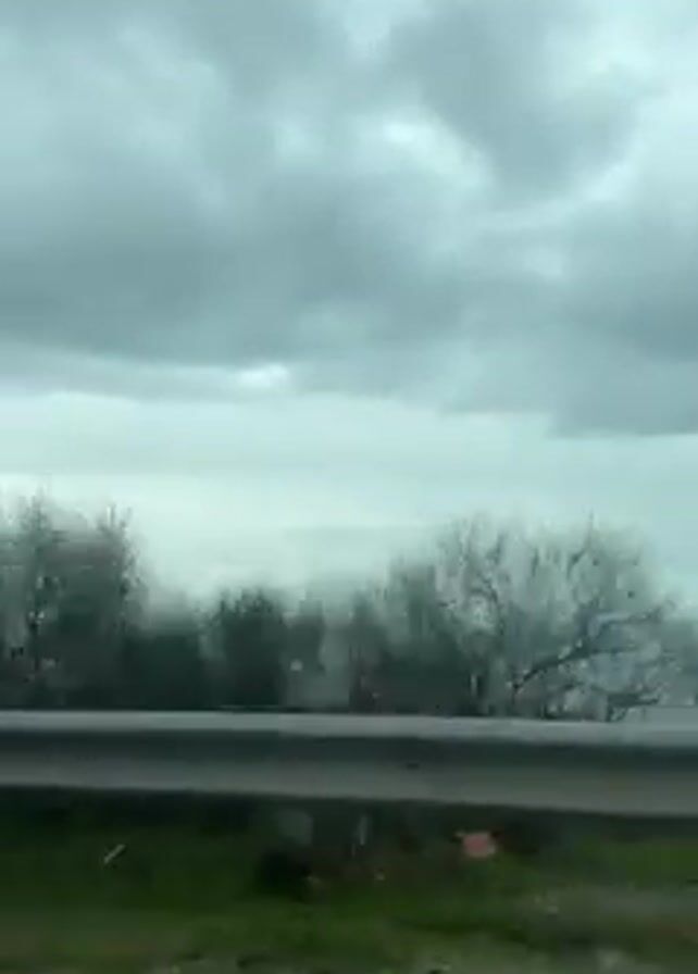 view from a moving vehicle, driving along a coastal road. A metal guardrail is visible in the foreground, separating the road from a view of the sea. The sky is overcast with heavy gray clouds. Sparse trees and greenery are seen along the roadside. In the distance, a coastline is visible, and the sea appears calm under the cloudy sky. The video suggests a damp or overcast day with limited visibility.