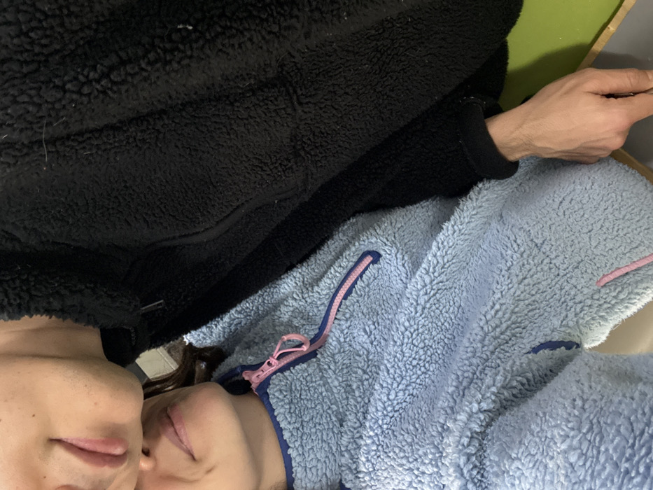 The image depicts two individuals in close proximity within an indoor environment in Palma de Mallorca, Spain. One individual, positioned lower and to the left, is partially visible from the chin downwards, wearing a light blue fuzzy fleece pullover with a pink quarter-zip and blue trim. Their gaze appears directed slightly upwards and right. A second individual, positioned higher and to the right, has their lower facial area (chin and mouth) and upper torso visible, clad in a black fuzzy fleece jacket. Their right hand is visible in the lower right quadrant, resting on an out-of-focus light-colored surface. The two individuals are positioned with their faces in close contact, leaning towards each other. A bright green vertical surface is visible on the far right of the frame, behind the second individual.