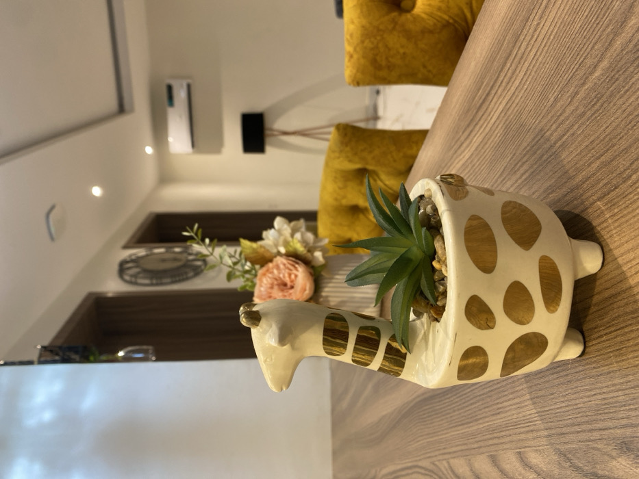 An interior room in Ojomu, Nigeria, is depicted. A white ceramic planter, shaped like a giraffe with gold-colored spots and stripes, rests on a light brown wooden table surface in the foreground. It contains a small green succulent plant surrounded by light-colored pebbles. Behind this, a white ribbed vase holds artificial flowers in shades of peach and white. Two yellow, tufted armchairs are partially visible further back. The background features light-colored walls. A white wall-mounted air conditioning unit is on the right wall, below which stands a tall floor lamp with a black cylindrical shade. A large, dark circular wall decoration is mounted between two brown wooden door frames on the left wall. The white ceiling contains multiple recessed lights. No individuals are present in the scene.