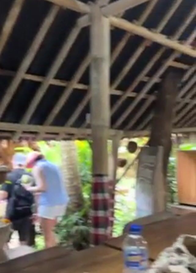 interior of a wooden structure with an open view to lush greenery outside. The roof is made of bamboo or wood. Two people walk into the frame from the outside, one wearing a black backpack. The camera then shifts to a woman inside, who has a white substance applied to her forehead. She is sitting at a wooden table. There is a water bottle on the table next to her.