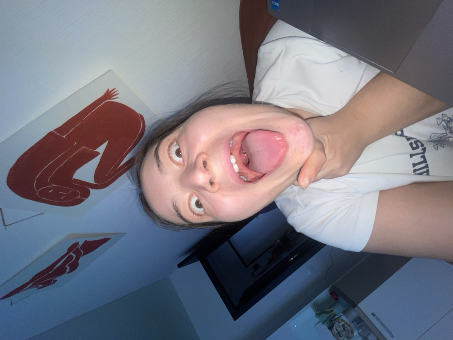 An indoor photograph from Balashikha, Russia, captures a close-up, low-angle view of an adult female. She is seen with an exaggerated facial expression, featuring wide, upward-gazing eyes and a widely open mouth with her tongue extended. Her right hand is placed firmly beneath her chin, applying pressure to her throat or lower jaw. She wears a white short-sleeved t-shirt with a dark graphic partially visible on the chest. In the background, two framed artworks, depicting abstract red figures on white canvases, hang on a light blue wall. To the left, a dark doorway reveals a glimpse of an adjacent room with white cabinets. A dark-colored laptop, featuring a 'CORE i' emblem, is visible on the lower right.