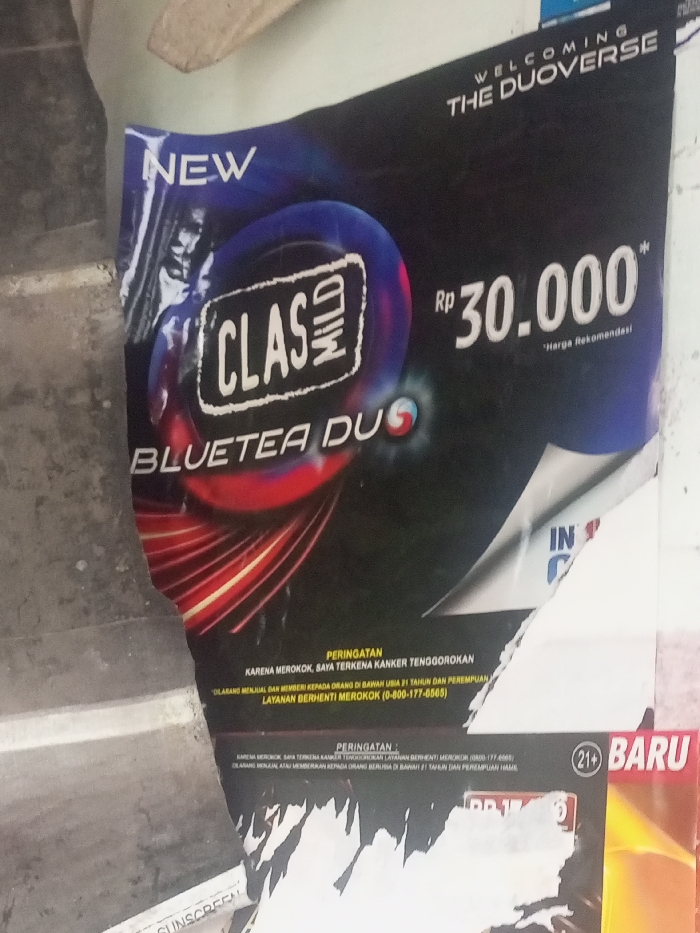 The image displays a weathered and partially torn promotional poster affixed to a light-colored, textured vertical surface, likely a wall or pillar. The poster, predominantly dark blue and black, advertises a product identified as "CLAS MILD BLUETEA DUO." White text at the upper left reads "NEW," and "WELCOMING THE DUOVERSE" appears at the upper right. The central graphic features "CLAS MILD" within a white outlined box, encircled by a large blue ring, with a reddish-orange circular element and radial lines extending downwards. A price of "Rp 30.000*" is shown in white, with "*Harga Rekomendasi" (Recommended Price) below it, indicating Indonesian Rupiah. Below the main advertisement, several white warning labels in Indonesian are present. One states: "PERINGATAN: KARENA MEROKOK, SAYA TERKENA KANKER TENGGOROKAN" (WARNING: BECAUSE OF SMOKING, I GET THROAT CANCER). Another warning declares: "DILARANG MENJUAL DAN MEMBERI KEPADA ORANG DI BAWAH USIA 21 TAHUN DAN PEREMPUAN" (PROHIBITED TO SELL AND GIVE TO PEOPLE UNDER 21 YEARS OLD AND WOMEN), followed by "LAYANAN BERHENTI MEROKOK (0-800-177-6565)" (QUIT SMOKING SERVICE). A second, partially obscured warning section is visible below this. At the bottom right, an age restriction symbol "(21+)" and the word "BARU" (NEW) from an underlying or adjacent red/orange poster are partially visible. The poster exhibits significant creasing, crumpling, and tearing, particularly along its left and bottom edges, revealing a lighter surface underneath. To the left of the poster, a dark gray, rough-textured vertical surface is present. No people are visible. The language on the poster is Indonesian, which contrasts with the specified city location of Zee Pin Kone, Myanmar.