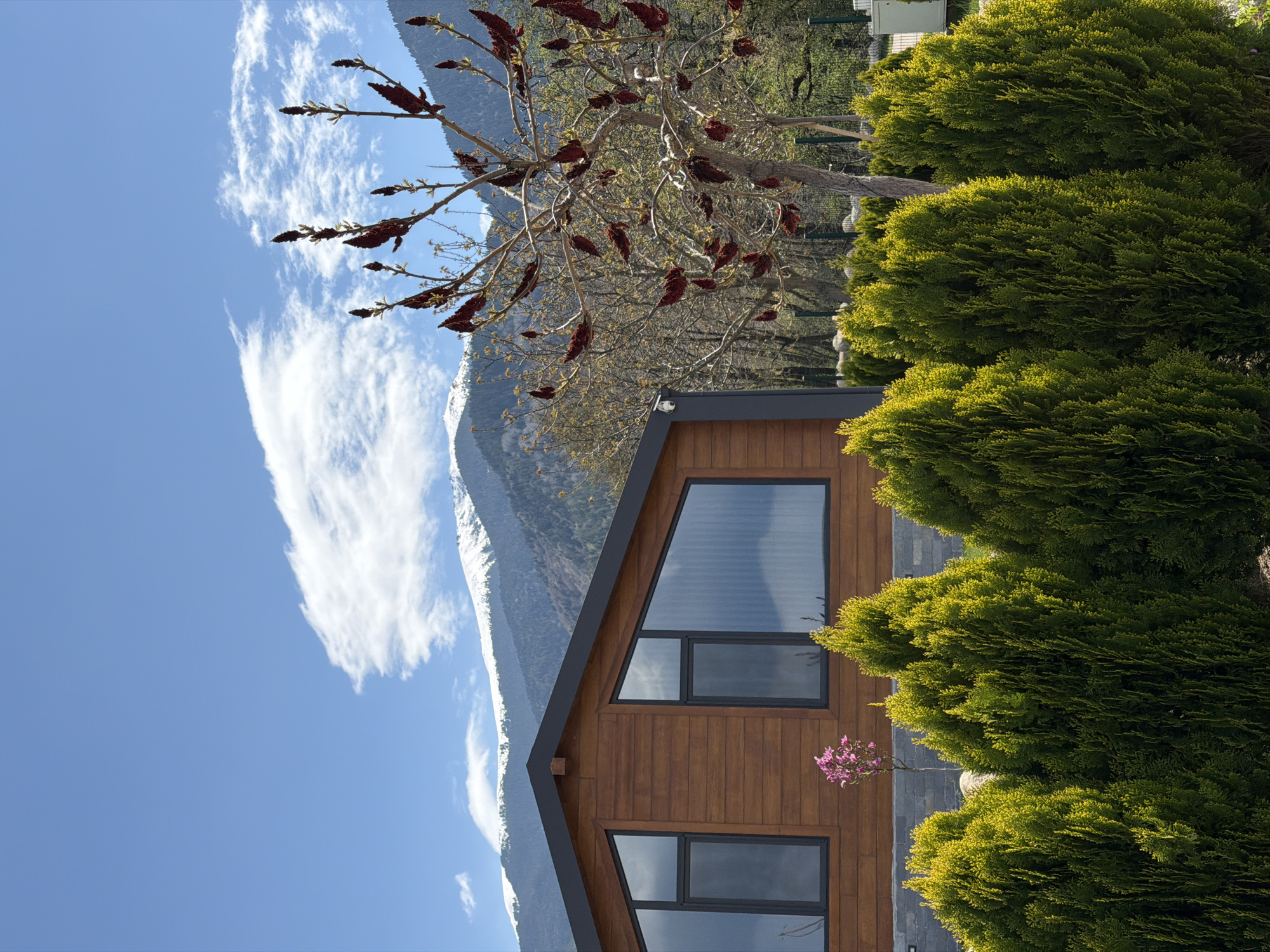 A low-angle, rotated outdoor shot captures a wooden cabin nestled within the landscape. The cabin features a dark grey roofline and window frames with a distinctive angular window on the upper level. A tree with bare branches and red seed pods is visible. The front of the cabin is flanked by green bushes. The sky is bright blue with long white clouds. A snow-capped mountain forms a backdrop. The location is Samoranovo, Bulgaria.