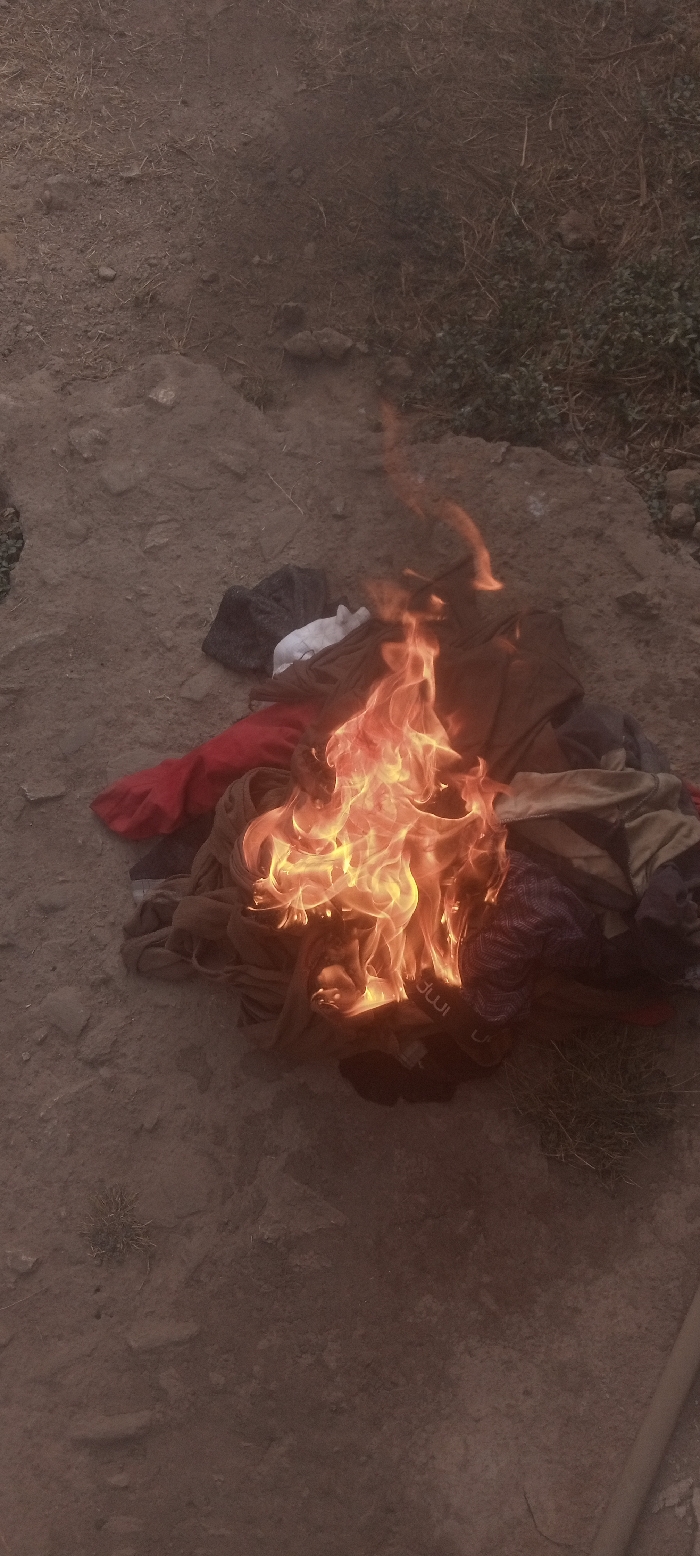 A pile of clothes is engulfed in bright orange flames, set on a patch of rough, dry ground. The fabrics are various colors, including red, black, white, and shades of brown. Flames reach upwards, partially obscuring the items. The ground is a mixture of dirt and sparse vegetation. The overall scene is unsettling, implying destruction.
