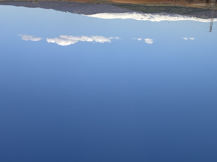 The scene is located in Dren, Bulgaria. The image presents a wide landscape under a predominantly clear, bright blue sky that occupies the upper two-thirds of the frame. A faint white aircraft contrail is visible in the upper-right quadrant of the sky. Below this, a horizontal cluster of small, scattered white cumulus clouds is present. Across the midground, a mountain range extends horizontally, its peaks covered with white snow. Below the snowline, the mountain slopes exhibit dark green coloration, indicative of dense forestation. The foreground consists of agricultural land, appearing in shades of reddish-brown and brown, suggesting bare or fallow fields. On the far left, a section of a grey metallic lattice-style electrical transmission tower rises from the lower edge. A flock of approximately a dozen small, dark birds is visible in flight to the immediate right of the transmission tower. Sparse, deciduous trees, devoid of leaves, are scattered across the lower-right portion of the frame and along the distant foothills. No human figures are present.