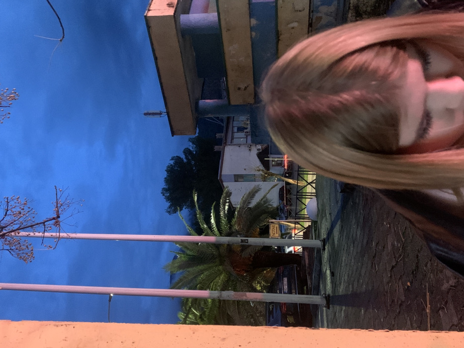 A nighttime shot features a cloudy, blue sky with a sparse tree to the left. A palm tree stands behind two pink poles. A building and a multi-colored structure are visible. The partial face of a person with blonde hair is in the foreground on the right, with their eyes closed.