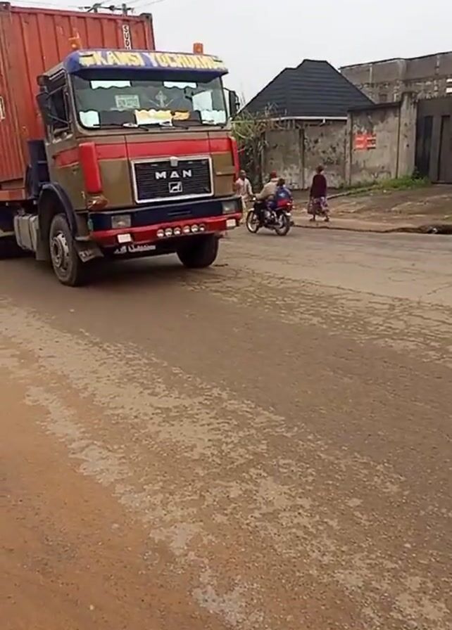 MAN truck carrying a red shipping container traveling along a weathered asphalt road