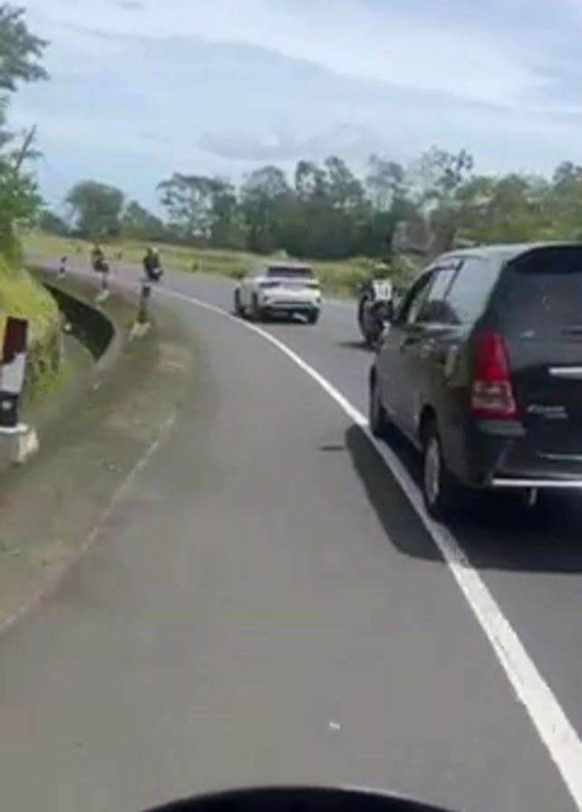 road scene with a white car and several motorcycles traveling on a grey asphalt road. A black car is parked on the side. The motorcycles are black scooters, with two carrying passengers. The first scooter has a "10" on the back of the rider's jersey. Green trees and grassy areas border the road. The sky is partially cloudy. The video is shot from the perspective of someone riding another motorcycle.